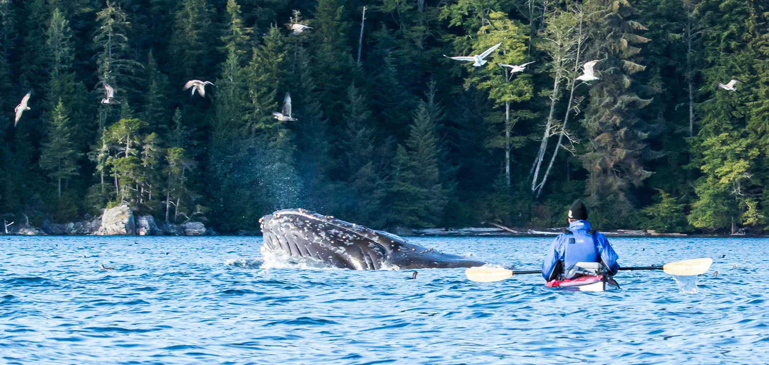 We took a couple of kayaks — a double for Mel and Ken and a single for me. We paddled out in to the mirror-smooth Blackfish Sound as the descending sun turned the water a dazzling silver. Almost immediately we spotted a whale’s spout half a mile away. It was a humpback, not a killer whale, but I wasn’t complaining. With an alacrity not possible with the bigger group, we sped towards it in our little fibreglass vessels, and that great leviathan rewarded us with an unforgettable display.